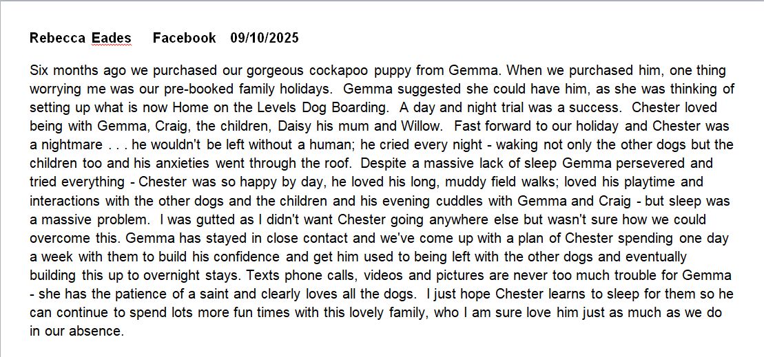 Our journey into home dog boarding has already begun, and it’s been such a rewarding experience and I’ve already received some complimentary comments on my Reviews page. What started with looking after friends’ dogs has naturally grown into welcoming new clients and their much-loved dogs. Our two dogs absolutely love the extra company and have made plenty of new friends along the way! It’s been wonderful to see our home filled with happy, wagging tails — and we can’t wait to continue building our little dog-loving community.